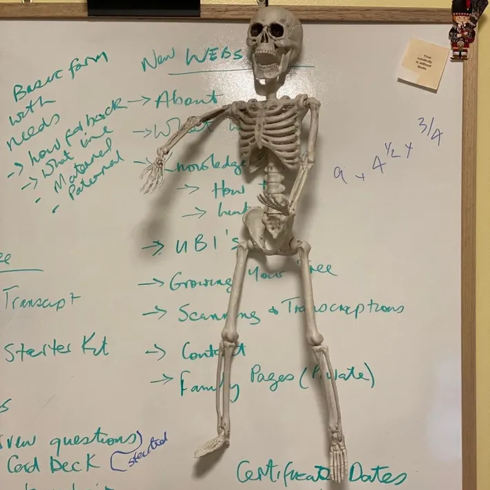 Ghillie is the Skeletons in the Closet Genealogy Assistant! You might be wondering where the name Ghillie came from. Well, the word ‘Ghillie’ is Gaelic for man-servant, and this is essentially what his role entails. The Ghillie is your personal assistant while you are fishing! So, while I ‘fish’ for your relatives, Ghillie will be right by my side helping me 😊. He can usually be found hanging around my whiteboard waiting to take notes!